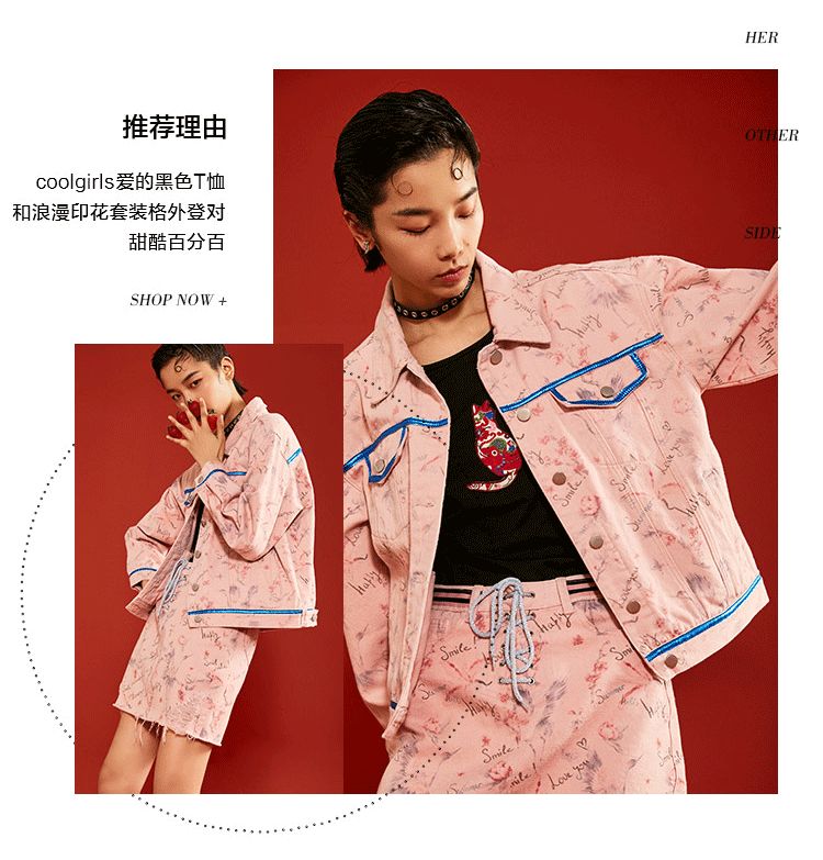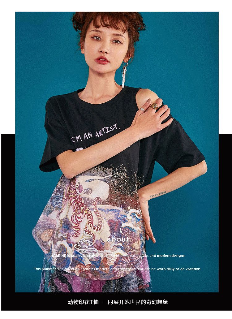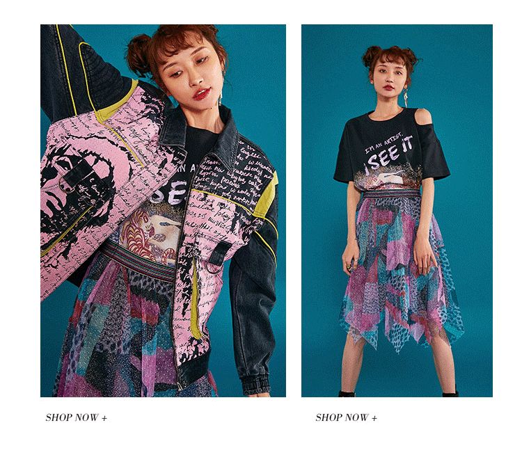 幻夜动物印花T恤不规则的单侧露肩设计+涂鸦牛仔外套&印花网纱裙挥洒自由不羁的摇滚色彩