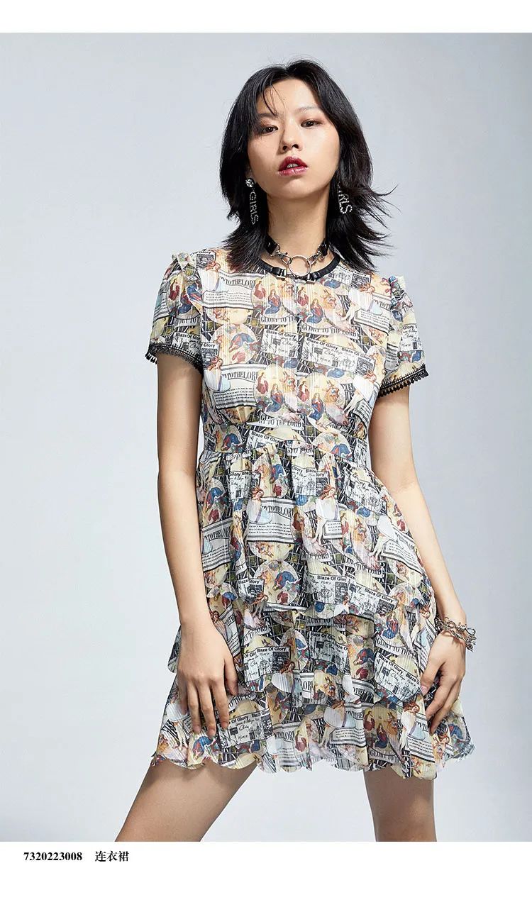 领口处拼接超纤皮革,袖笼处拼接水溶花边,裙摆底边以激光热切技术收边,实现荷叶边造型,轻巧的裙摆层叠效果恰到好处,腰间曲线的收身设计迁移裙身中心的视觉焦点,不显膨胀臃肿。搭配腰封单品,爵士风超酷出街。