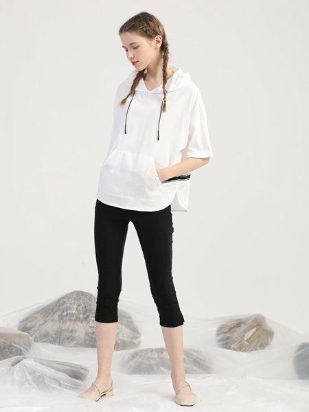 穿搭的高级感来源于简单清爽的配色,经典耐看的黑白配就非常的符合这个配色了,一件白色的五分袖上衣搭配黑色的束脚裤,简洁、干净,上衣采用了连帽抽绳的设计,时髦感十足,衣身还贴心的增加了口袋的设计,方便实用,整体look营造出简约的高级美。