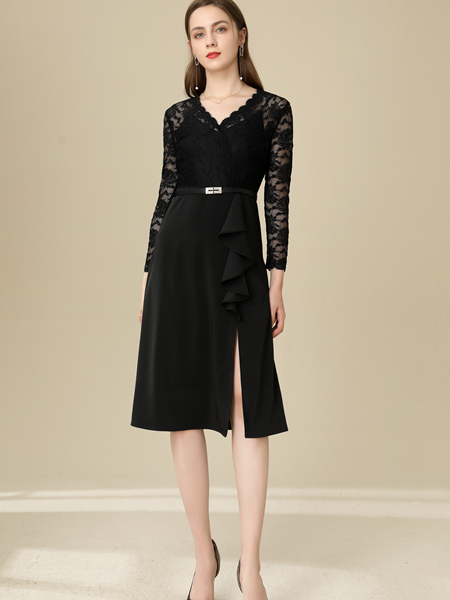 这款黑色蕾丝优雅连衣裙是很精致时尚哦,V领的蕾丝花边和袖口的性蕾丝设计很是时髦,裙摆采用个性开叉设计的设计也是一大亮点,版型是修身的,小黑裙作为经典百搭的时尚单品是女神的必备款哦,不需要过多的装饰就可以穿出简约温柔气质,搭配一双高跟鞋,整体的造型优雅大方。