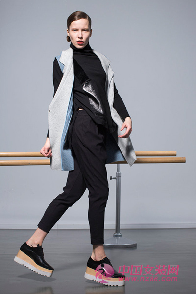 灰白与灰蓝撞色的马甲,一粒扣茧型轮廓,彰显着高品位,而立体修身的长裤同样具有品味格调,二者搭配,即是经典。
