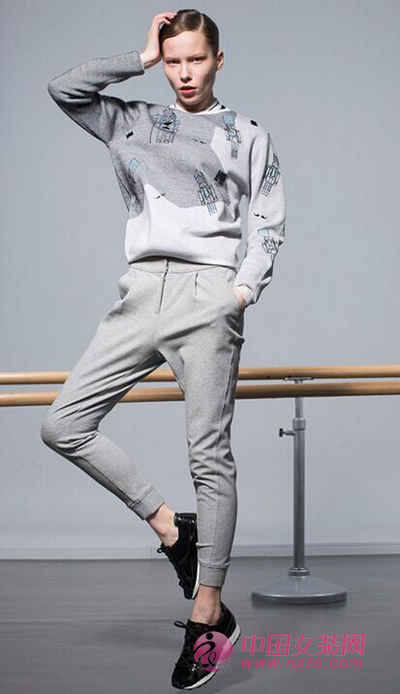 棒球衫短款棉服休闲风浓郁,搭配立体休闲九分裤,塑造富有变化的美感。