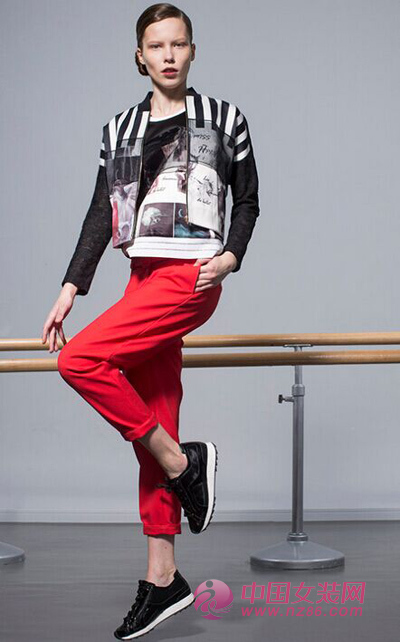 短款拼接印花外套,光泽滑柔,内搭空气层无袖印花衫,下搭宽松小直筒裤,挺括、运动、有型。