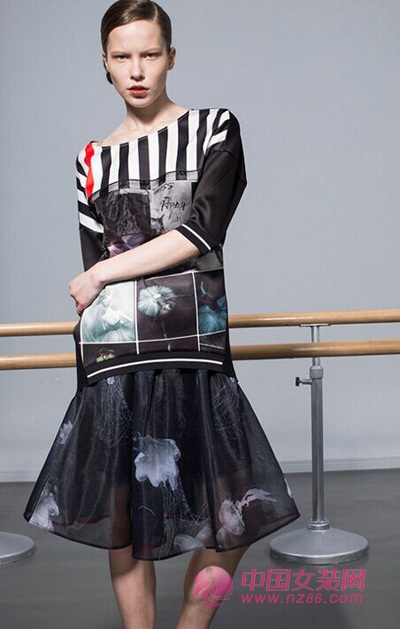 几何条纹、透视拼接、文艺芭蕾图案印花使长款五分袖十分具有视觉冲击力,繁而不乱,富有美感。