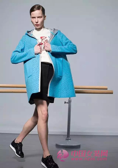 线条简洁的直身型连帽大衣,由不规则冲孔镂空处理的双层双面结构精纺针织毛呢面料剪裁而成,色调清新明丽,灰蓝撞色独具吸引力。