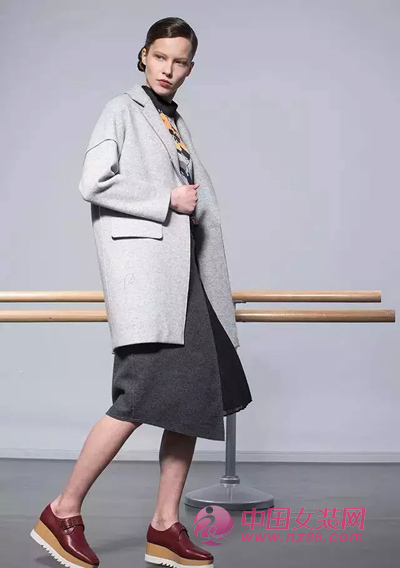 荷比俪2015秋装新款推荐:宽松茧形的中长款大衣,于灰白色调中演绎典雅韵味,内搭不规则剪裁、抽象印花上衣,下搭精纺羊毛与精梳棉织就的半裙,不同材质拼凑出大牌气场。