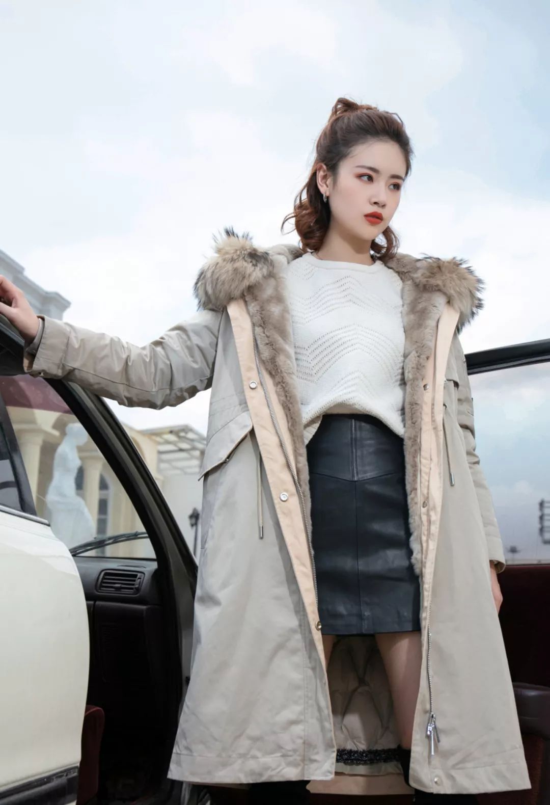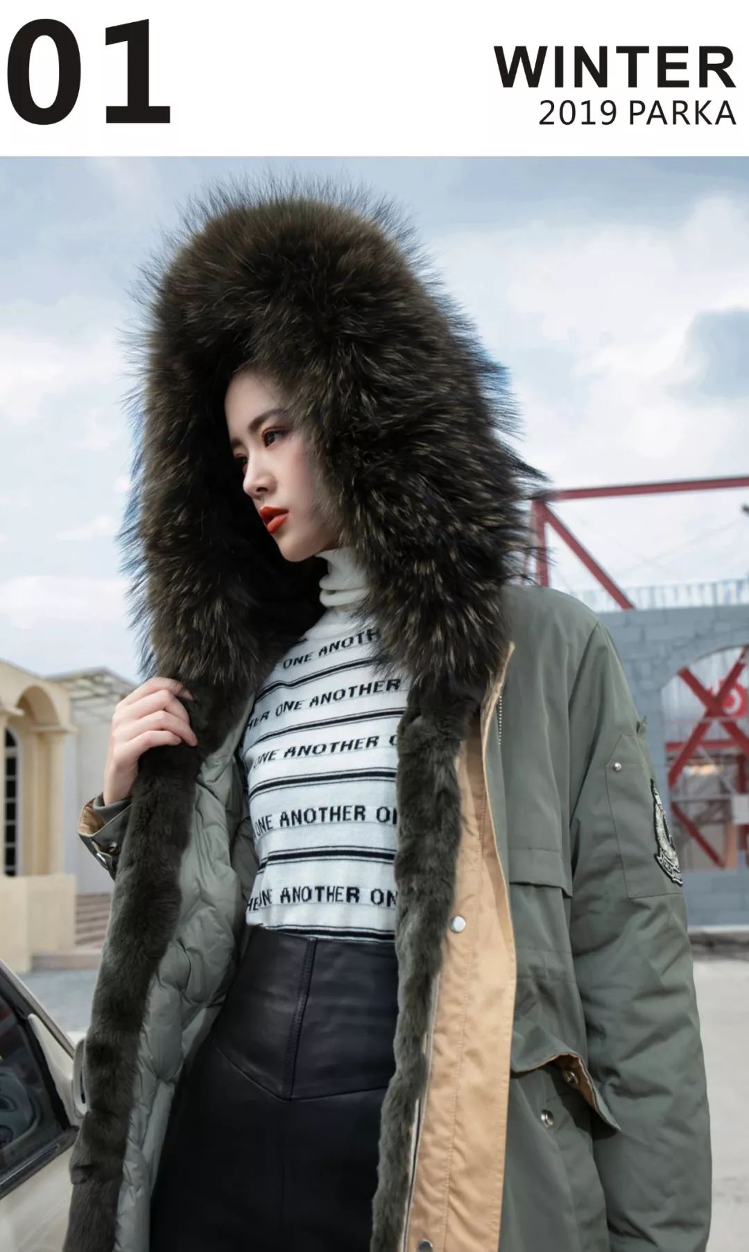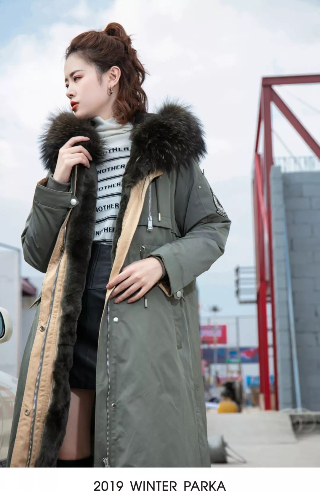 毛衣温暖又柔软,皮裙硬挺又帅气,搭配军绿色PARKA大衣,时尚又保暖的搭配方式