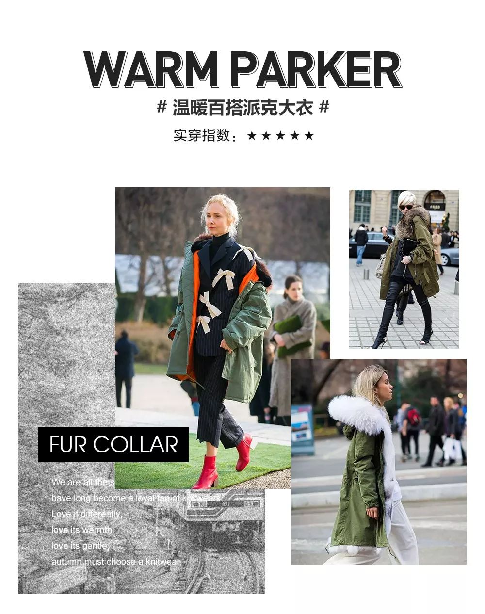 ? 如今,派克大衣逐步进化为多样化的单品,舒适,保暖,时尚,成为众多时尚达人冬季***的单品