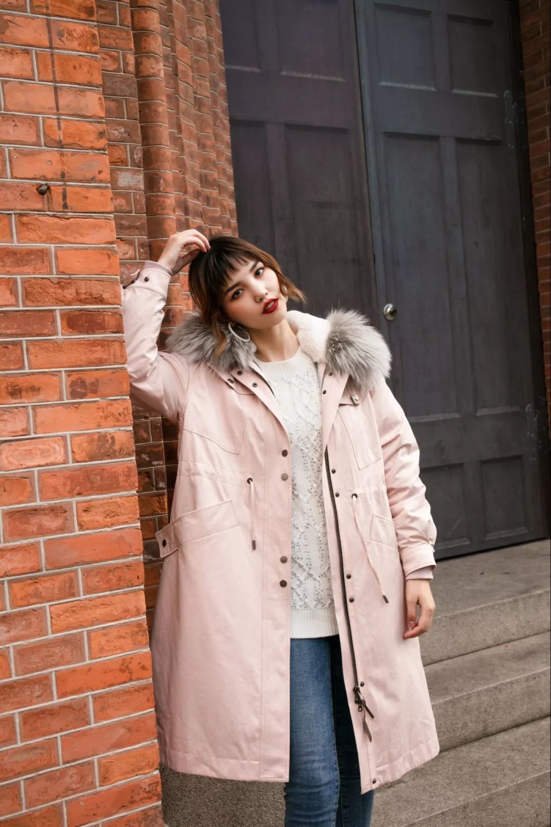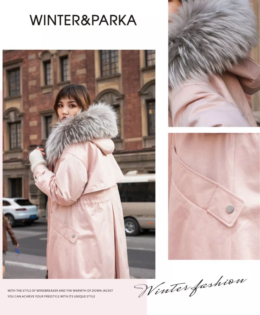 粉粉的派克服在冬天里是个甜蜜的存在