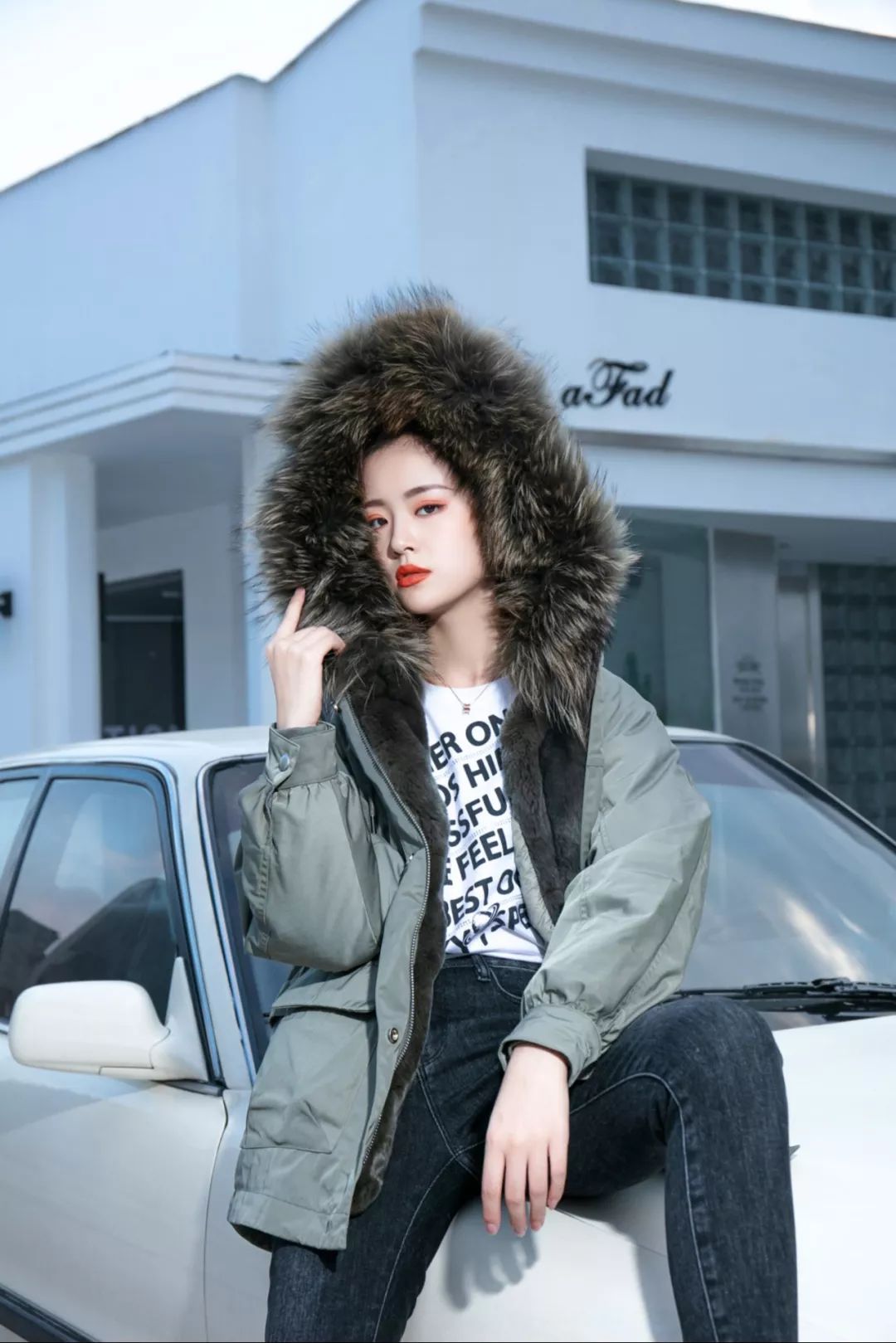 在寒冷的冬天不需要太多的服装搭配,只需要一件长T和紧身牛仔裤,加上一件质感饱满的派克大衣既可以打造独特的时尚个性
