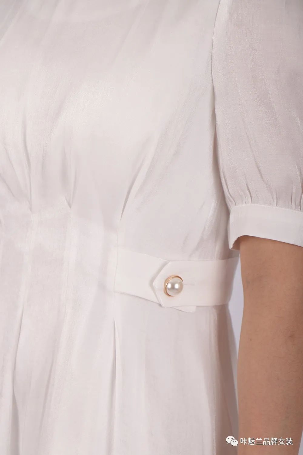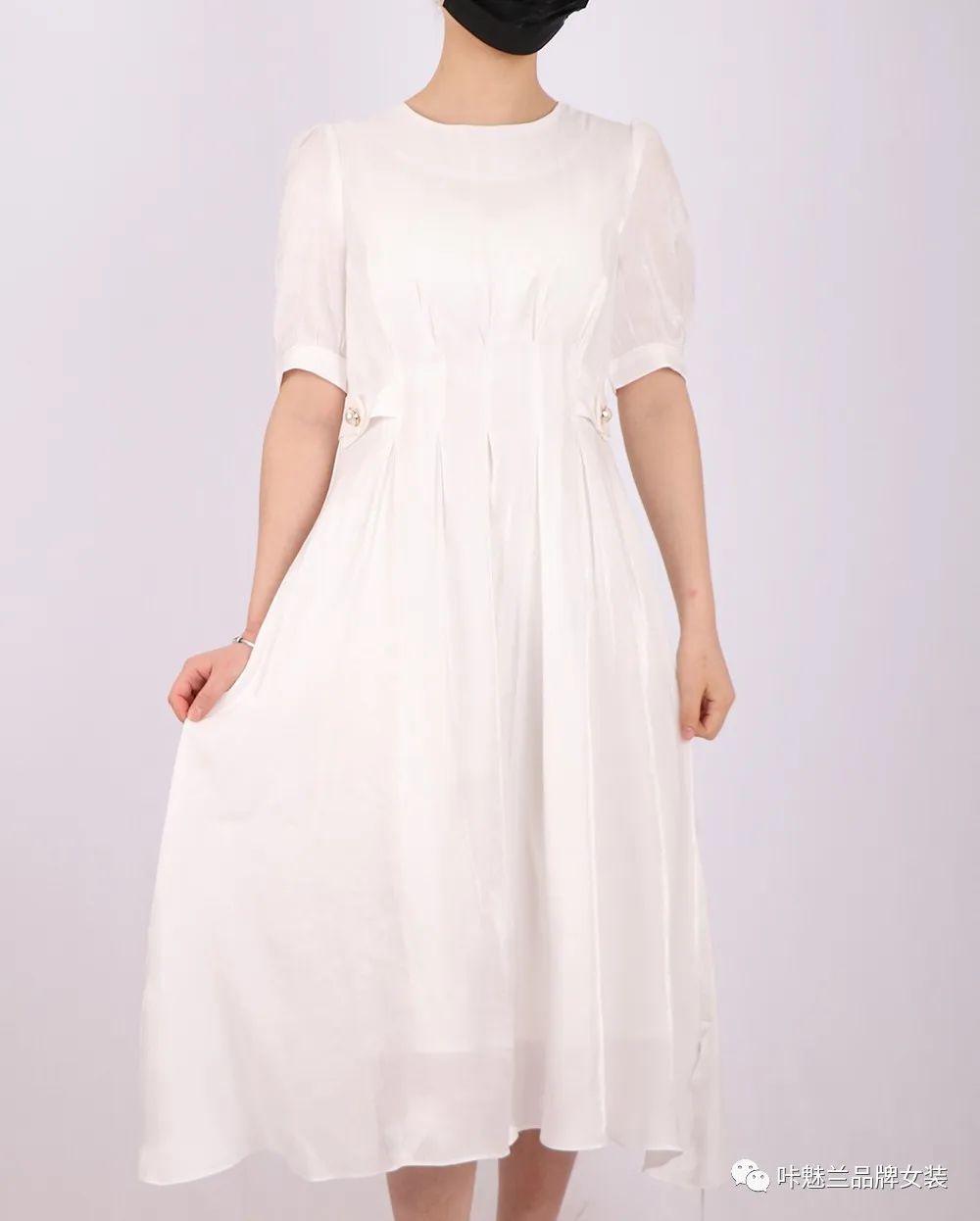 说完了黑色,怎么能忘记白色呢?春天最配仙女的颜色,必须是白色呀。白色雪纺仙裙,一上身,浪漫青春的少女感扑面而来。春天就是为你而来的。想着穿着这样的仙裙扎着麻花辫跑在绿草地上,躲在花丛里,微风扬起白色的裙摆,你笑靥如花,这宛如在梦里。来看亮点,注意到没,裙子腰线两颗精致的纽扣设计,又突出我们本次的主题,小“腰”精又上线了。而且它胸前波浪型的褶子设计加肩部小范围的泡泡袖设计,如森林的小鹿一样,动感灵动,总之,有了它,你就是仙女本仙。