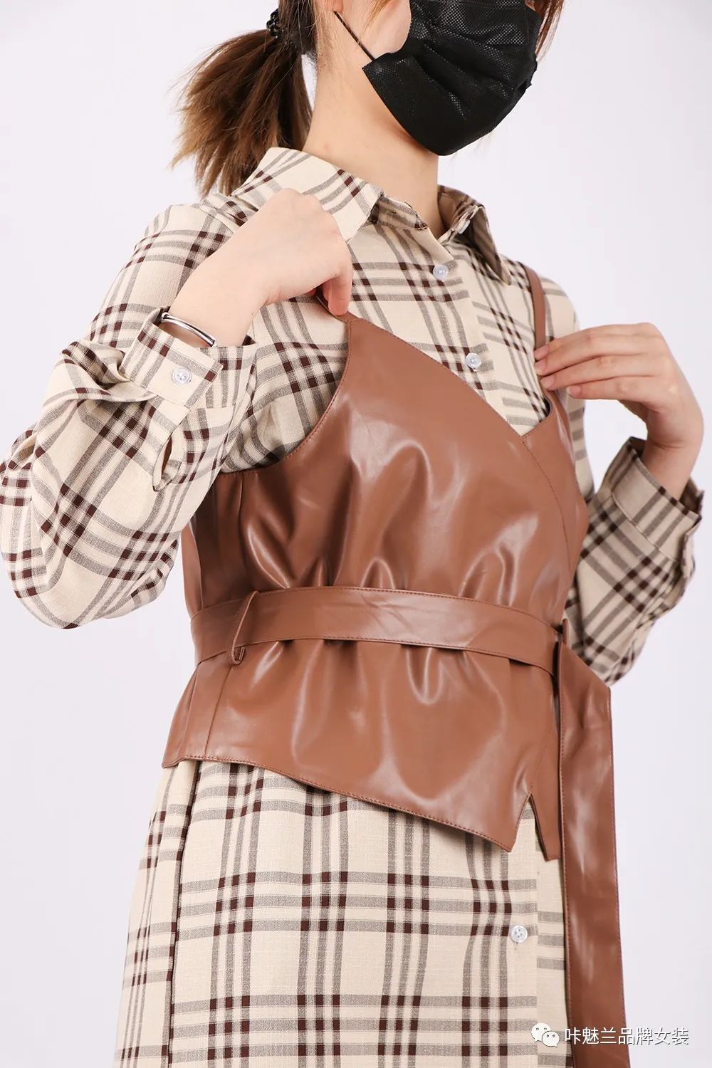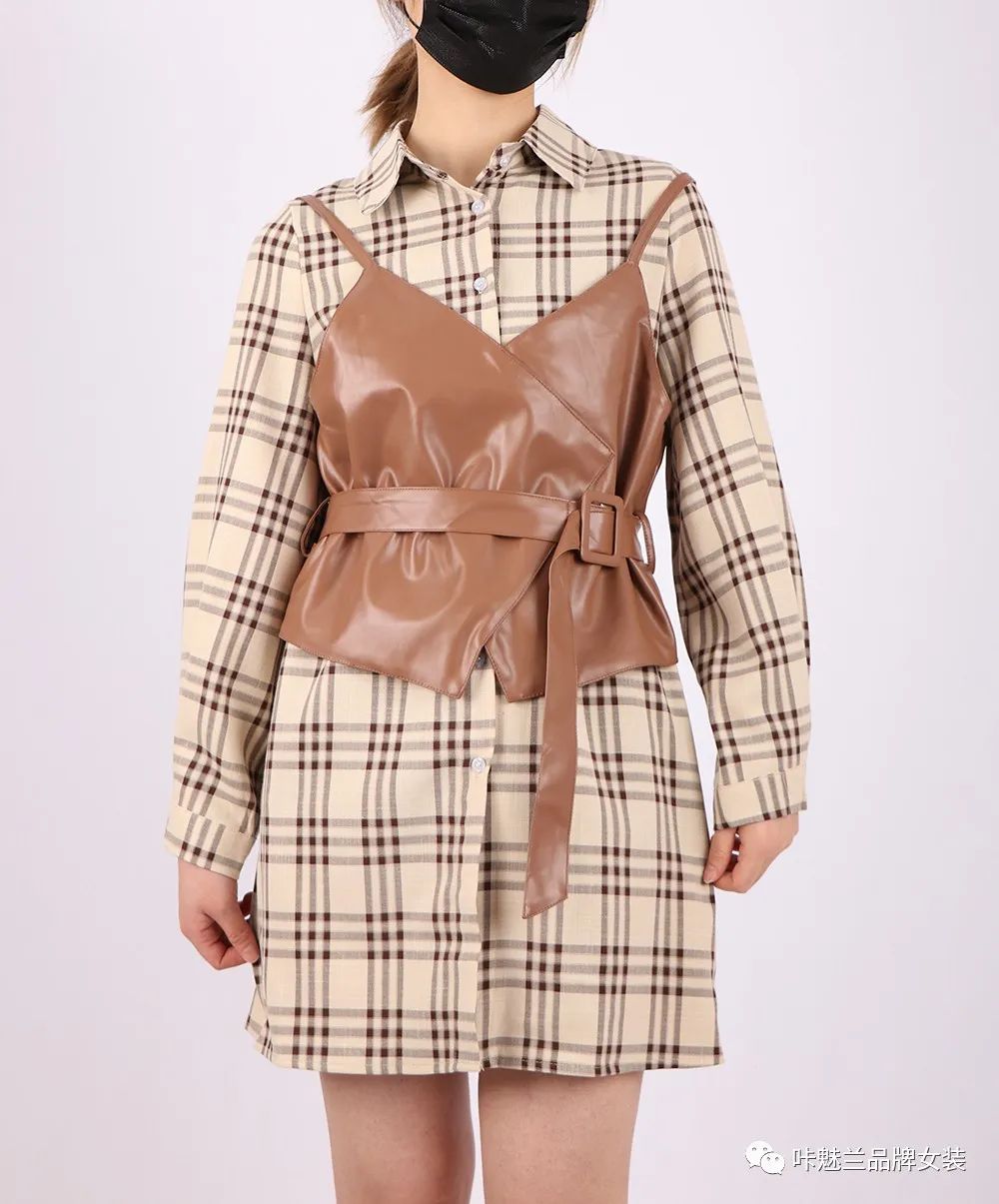 2020年的叠穿依旧是时尚,看看这条马甲格子,棉质的裙子加光泽感十足的皮革,时尚与舒适两不误,软萌妹子也能穿出酷酷的时尚感,马甲的小背心,透露出一丝小性感,马甲那条腰带,立马显出隐藏的腰线,裙短高于膝盖,更是打造胸部以下都是腿的错觉感,比例完美,穿上它,你就是街上最美的仔。