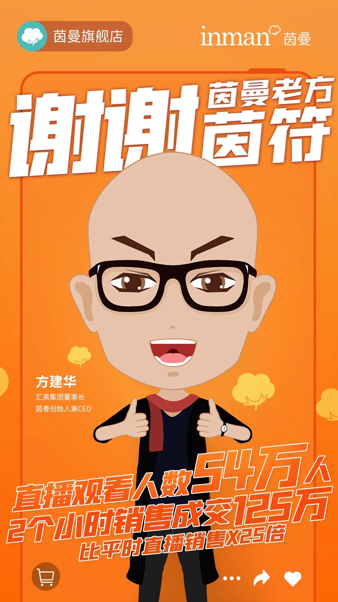 4月20日下午2点,汇美集团董事长、茵曼创始人兼CEO方建华亲临茵曼淘宝直播间,化身“导购员”,开启淘宝直播卖货首秀。直播期间,方建华不仅带来了清空购物车、现金红包等百万福利补贴,更有特批的购衣“宠粉价”,给到粉丝们特别的惊喜。