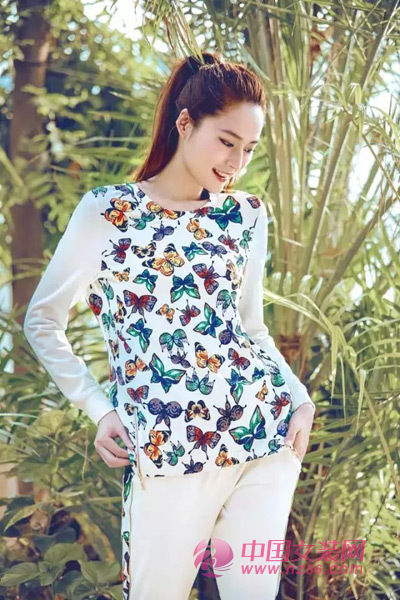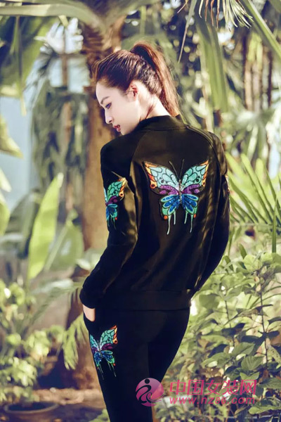 EP雅莹女装2015秋季运动装流行印花元素。蝴蝶,这一大自然的精灵素来就是秀场T台的宠儿,受到诸多时尚设计师的青睐。 Elsa Schiaparelli视蝴蝶元素为幸运符号,运用到服饰设计中;痴迷暗黑美学的Alexander McQueen也用蝴蝶标本演绎哥特风时装秀;Jean-Paul Gaultier更是将其带到了高定秀场。EP雅莹的世博主题秀服“蝶舞”也带着这一备受追捧的时尚元素走过了北京、上海、深圳、成都、天津、沈阳。手工刺绣而成的彩蝶出现在秀服裙裾、腰封上,精湛的手工艺唯美而逼真地展现了自然之美,受到了大家的喜爱。