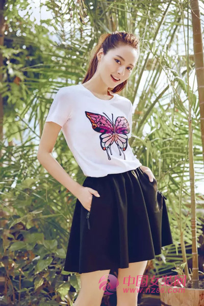 黑色版T恤的蝴蝶图案为蓝绿色调,而白色版T恤的是更为温柔的粉紫色。要做萝莉还是做御姐,不过是色彩的轻松转换。