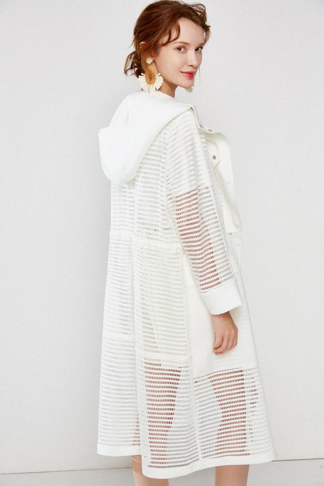 大落肩、连帽、透视,上身完全轻盈自在,毫无束缚感,可以从夏季一直穿到秋天。长至盖膝的长度,显得身型修长,走起路来仙气飘飘。
