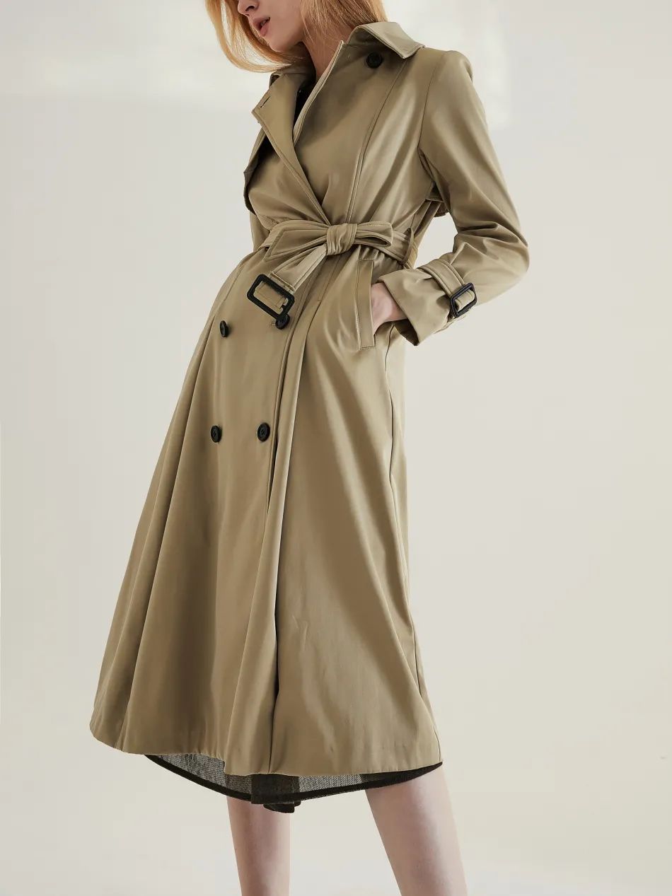 这件风衣特点——立体剪裁、有腰身、大裙摆。所以上身的感觉特别婀娜,随便一站,腰身特美,轻轻一转身,就能看得到潇洒的裙摆来。无论您的状态多疲惫,无论您丰满还是微胖,穿上这件风衣,都能抬升气质,让身姿苗条挺拔。两个颜色可以选择,黑色霸气,卡其色百搭。