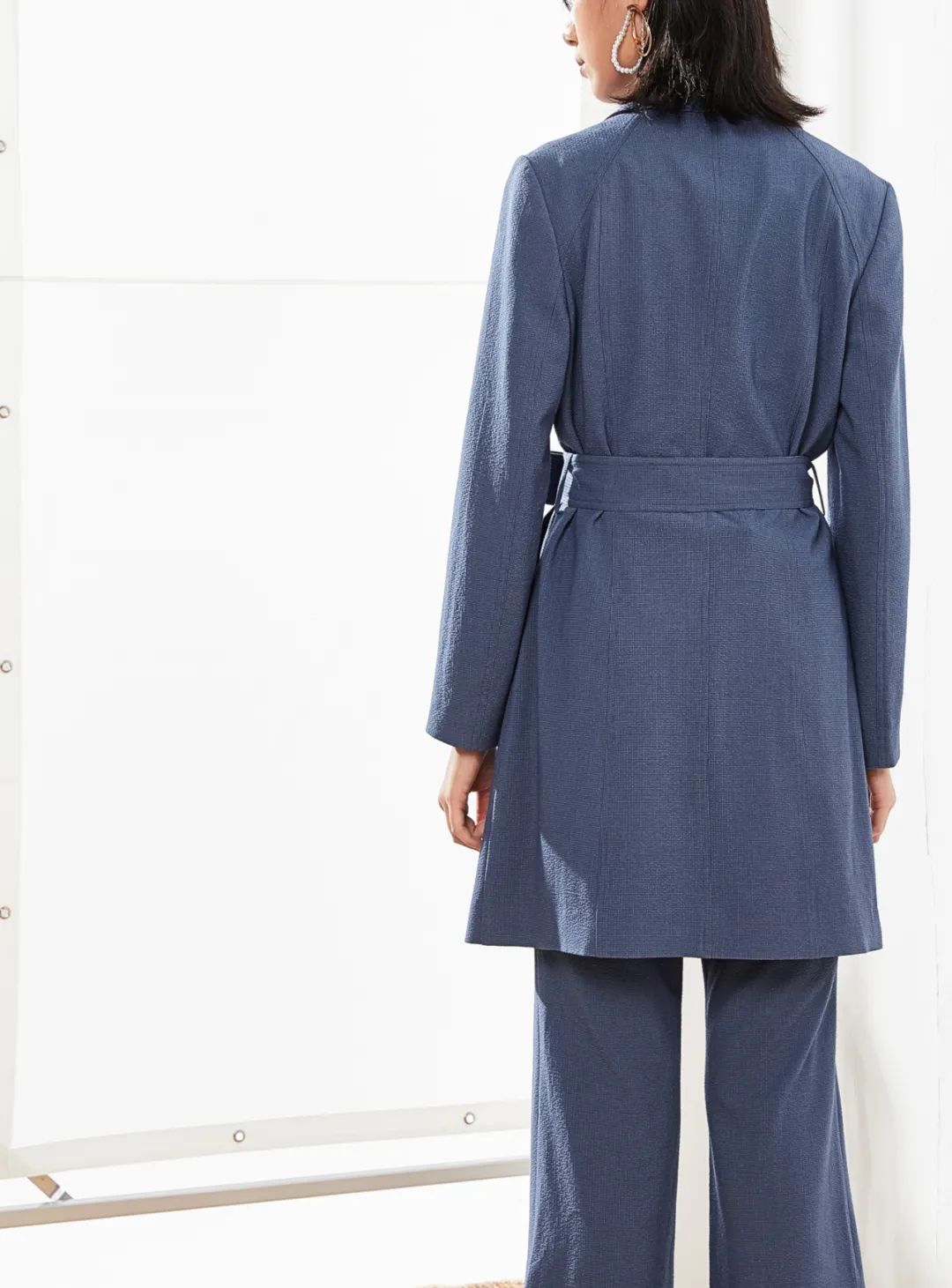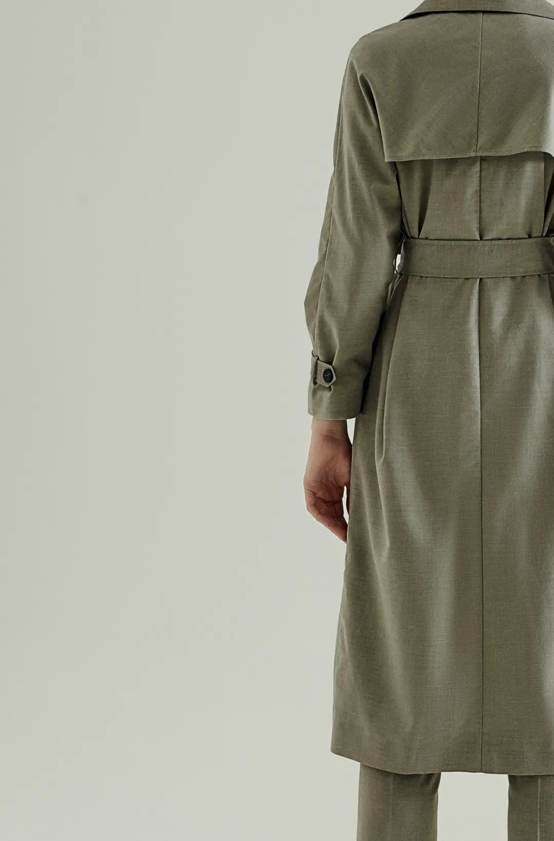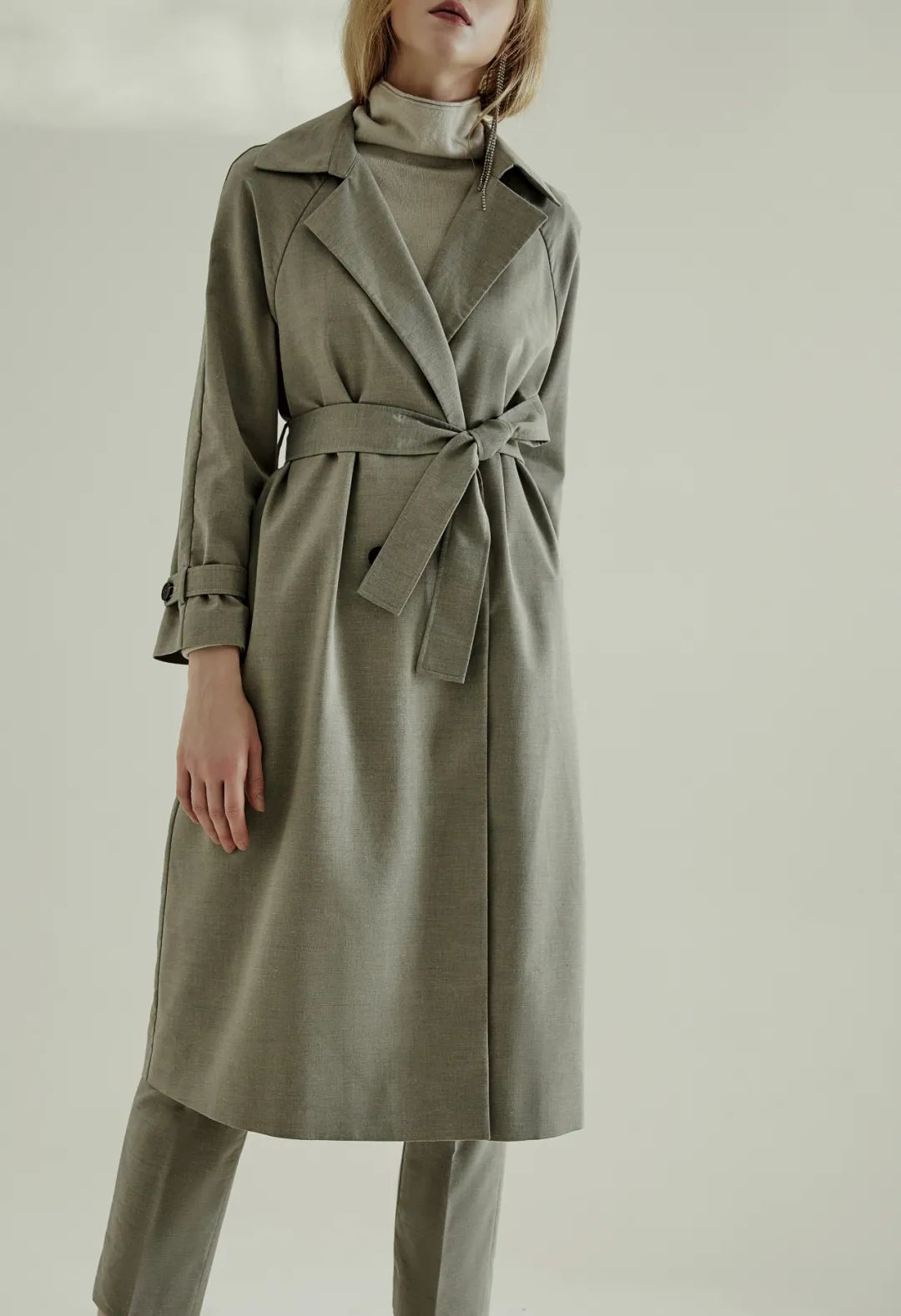 很潇洒休闲的版型,气场都像在流动一般。腰带系起来穿时拉紧一点,突出腰线和X廓形。面料有一层“柔和的光泽”,看起来更精致整洁。每一个视角都很帅美,灰色调高级满分。