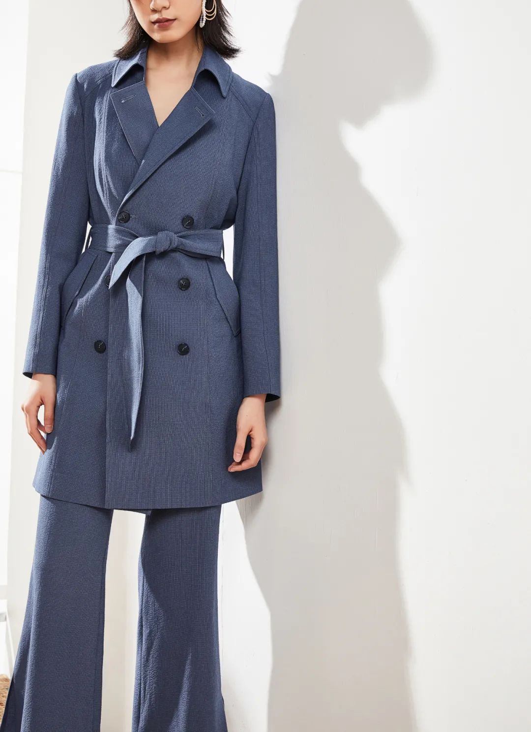 精致又利落的风衣,西装领口很显瘦又增添精气神,对于微胖人很友好的领型。浅蓝色女精英的既视感,显得人沉稳专业。细节满满的双排扣,配上腰带,腰身立显,持续增添气质。