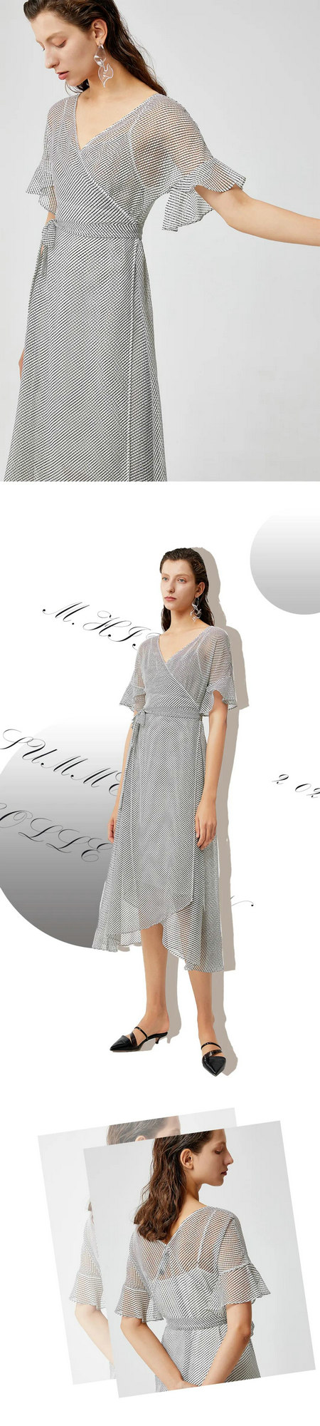 有些地方来了就回不去,有些衣服穿了就戒不掉。炎热高温天,依然能全身清爽凉快,镂空提花面料,不贴身不粘腻的优越感真的会上瘾。比条纹更丰富的印花,配上凸显脖颈线条的交叠领,和纤细腰身的系带以及不规则的裙摆。在你昂首挺胸不自知地走在商场和公司时,所有人都会跟着你的身影一起心动!最醉心的是一片式裹身设计,线条优雅自然。不对称裙角的错落感,翩若惊鸿。
