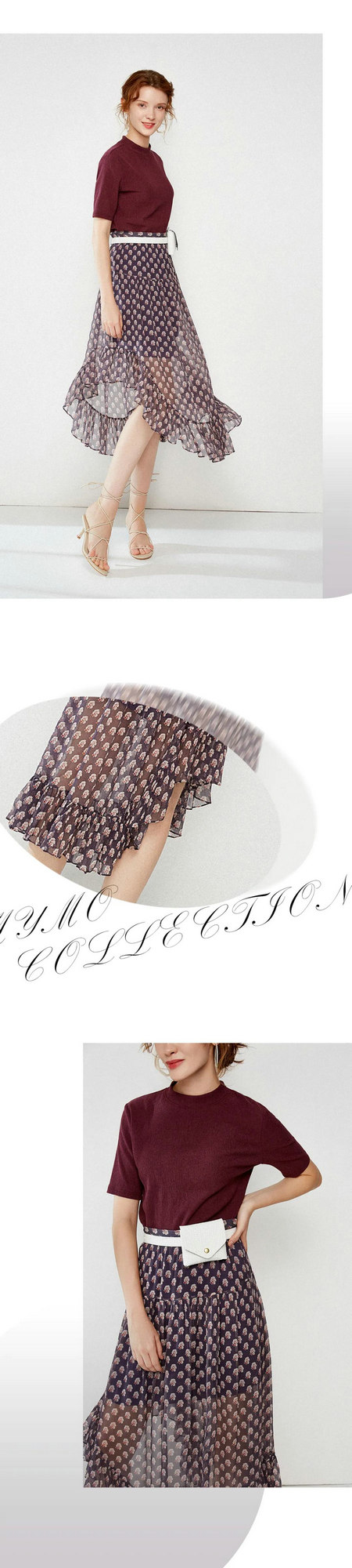不规则透视半裙,轻飘飘的,仙气萦绕。美到路人无法忽视,静静地撩人心弦。相信您穿上,幸福感很强很强。酱紫底色点缀复古印花,很独特不俗套的美感。斜摆加荷叶边的女性化细节设计,个性加分。轻盈灵动的裙摆,让你忍不住想挥起裙摆。站在镜子前,反复欣赏自己的美。搭配简洁的小高领针织短袖,既小众又很优雅。实在太美了,美在版型、美在细节、美在搭配。