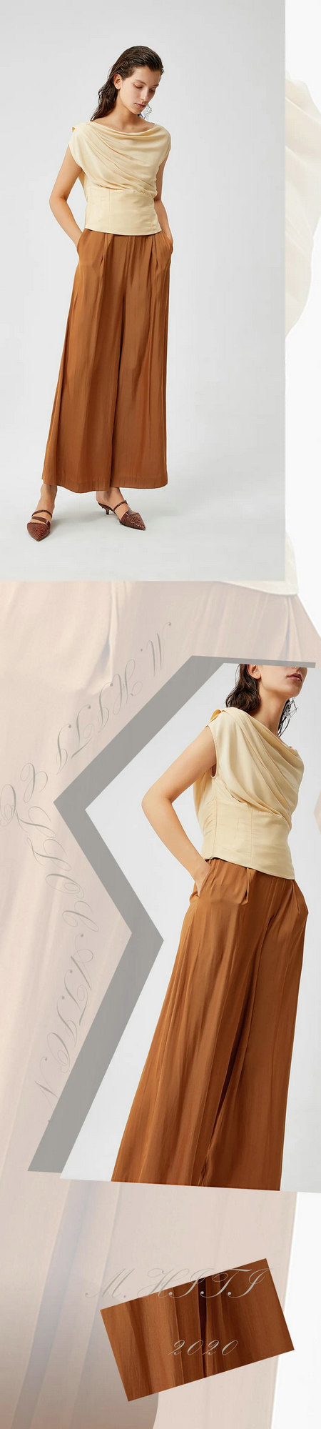 疯狂打call的搭配,复古又知性。看到实物你定会大喜过望,成为你今年最常穿的组合。地道地法式色调,温柔雅致又很舒服。上衣做了捏褶设计,褶量丰富,但不堆叠显拖沓。很有辨识度,走在人海中,女神范十足。穿上身垂坠修身不贴身,自然形成流畅线条。搭配姜黄色阔腿裤,一步一动都是灵动风情,几乎可以打通所有场合,通勤、逛街、约会都可。