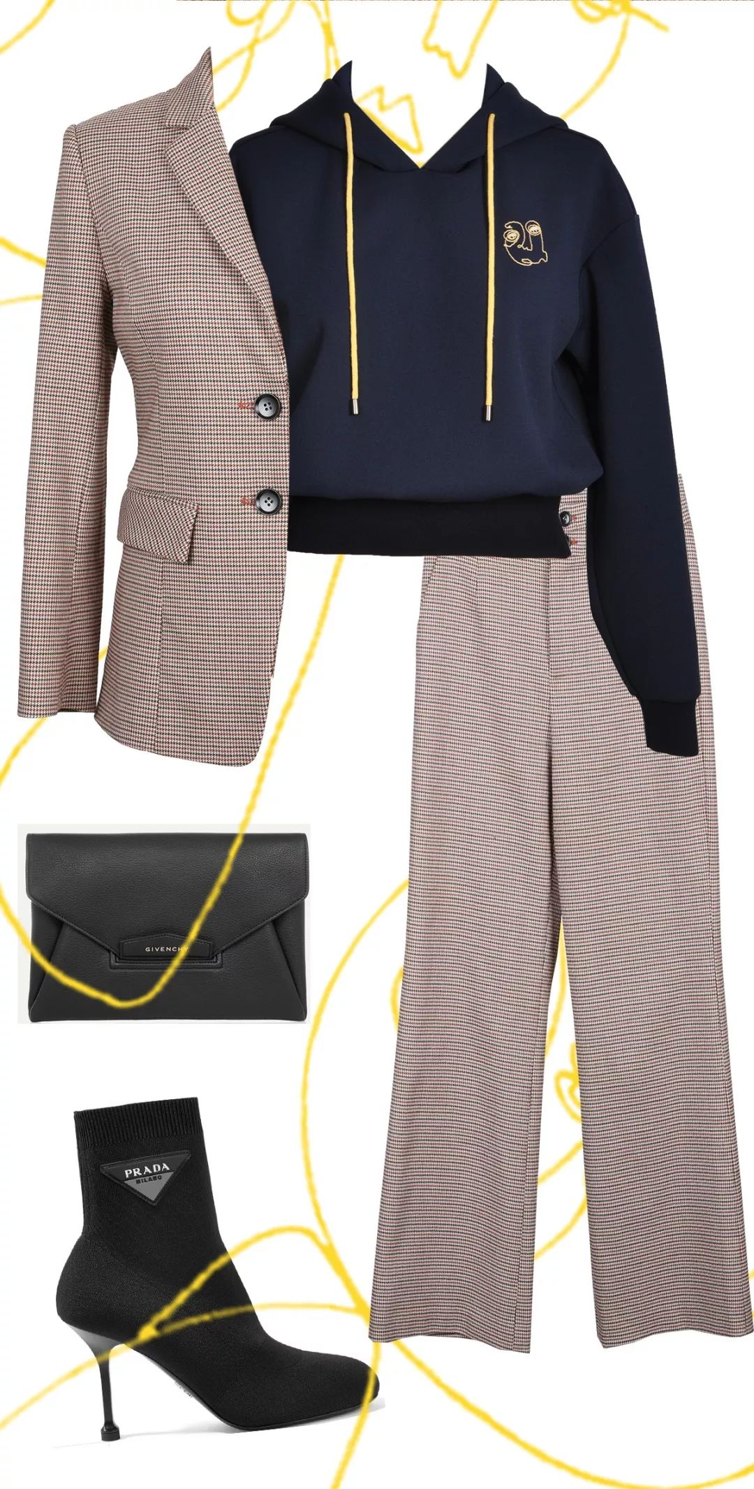一件简单的深色卫衣加一条格纹阔腿裤,