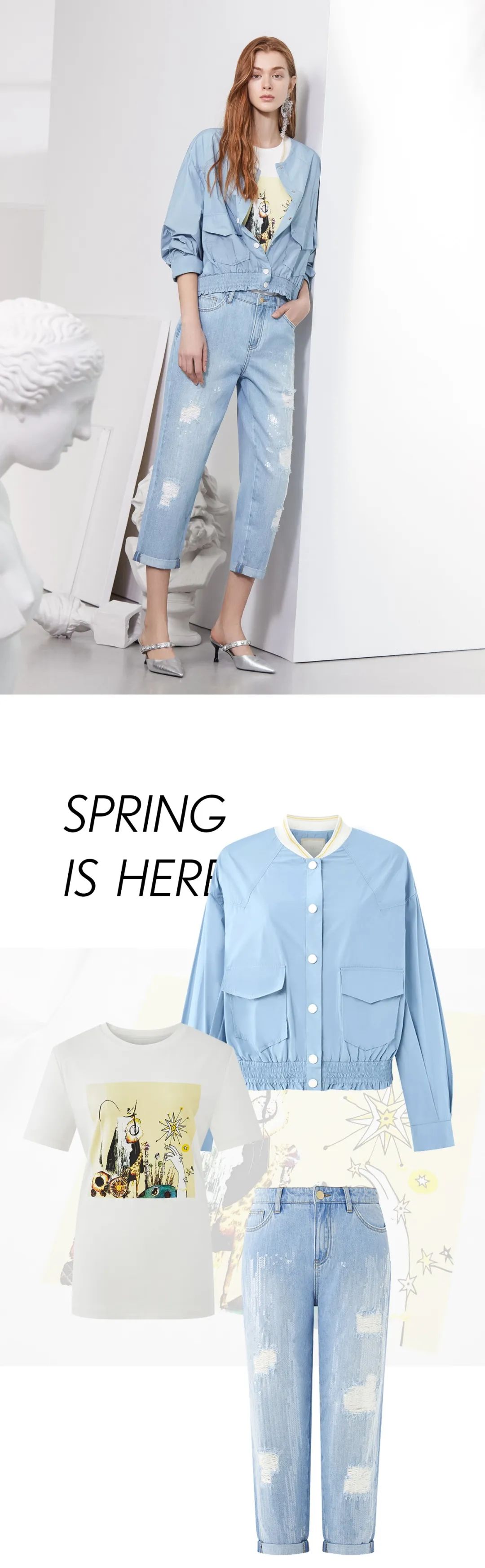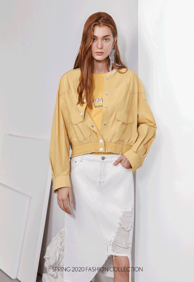 轻薄夹克设计荷叶边,搭配不对称牛仔裙,