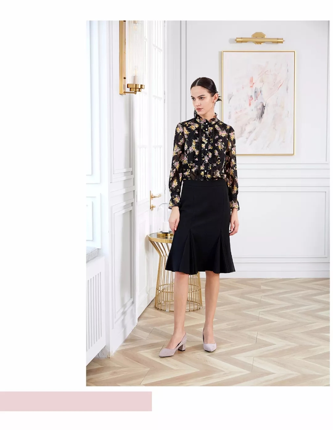 阡陌花浓,衣袖清香,印花衬衫勾勒出的秋日深深浅浅,小立领荷叶边的设计手法,加上袖口喇叭设计,富有韵味,搭配鱼尾半裙,让摩登主调下的复古情怀丝毫不减。