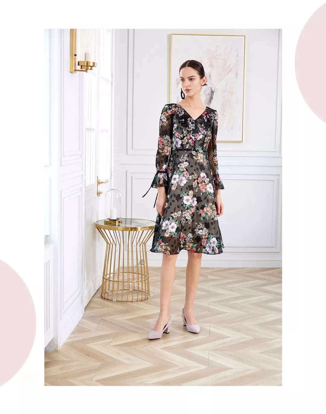收腰连衣裙采用立体裁剪手法制作,依照东方女性身型特点而专门设计,质地轻盈的雪纺让印花显色更为鲜艳逼真,荷叶边的加入,浪漫些许,令裙装愈发飘然。
