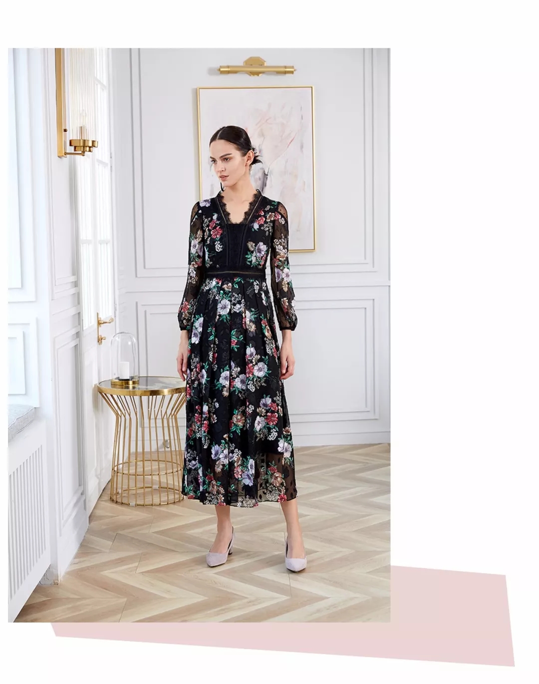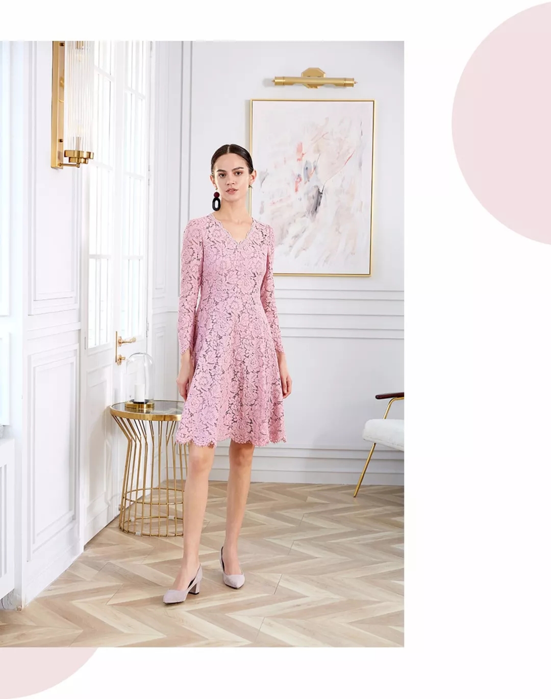 生性妩媚的蕾丝,精良的工艺处处彰显质感的上乘,JYGUGGE江韵古歌经典裙摆廓形,突显曼妙曲线的同时透露温柔气息,花边点缀V领设计延伸脸型和前胸美丽线条,这样的连衣裙总会叫人向往。