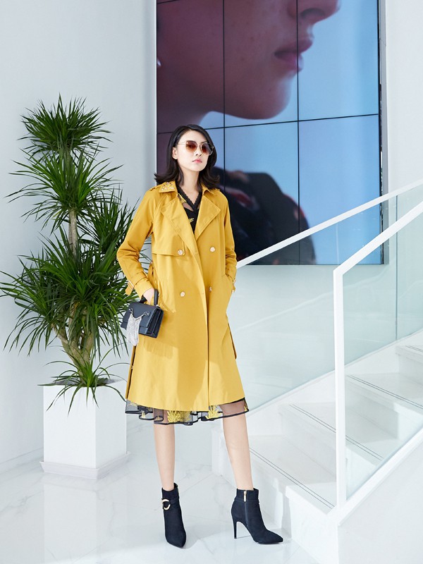 这款黄色风衣穿在身上很是好看也很显气质,翻领的设计简约大方,纽扣的设计简约大方,内搭一件碎花连衣裙,V领的设计简约大方,将自己性感的锁骨曲线展现爱你出来,裙子的设计很是好看,裙摆的长度露出性感的腿部,搭配一双高跟鞋,整体的造型简约优雅,而且黄色的颜色很是清新优雅,风衣也很显气质的哦。