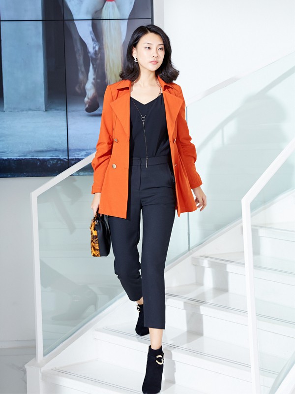 这款橙色外套的是小款的版型,穿在身上很是合身,内搭一件黑色吊带V领的设计将自己性感的的锁骨曲线展现爱你出来,版型都是很修身的,黑色的颜色简约大方,不需要多余的装饰就可以穿出不一样的感觉,下身搭配一件黑色裤子,高腰的设计简约大方,搭配一双高跟鞋,整体的造型精致有很干练穿出不一样的感觉。