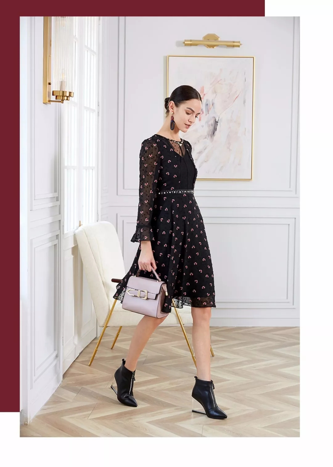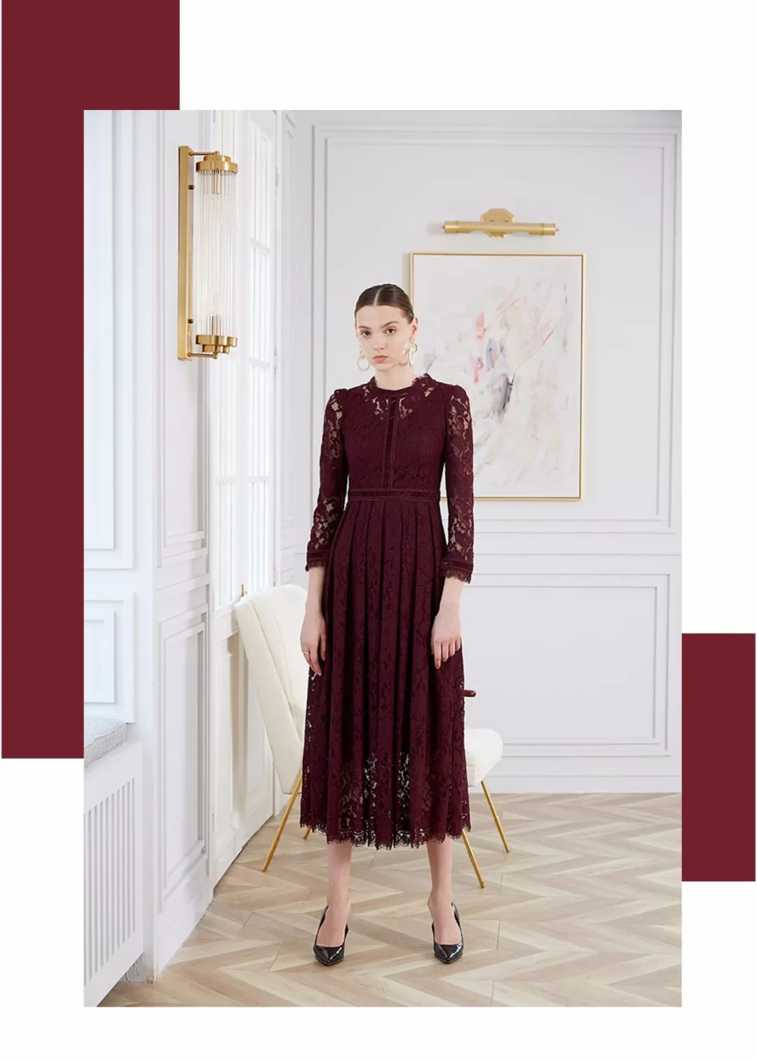 连衣裙的柔美特性搭配上陈年波特酒褐色的优雅迷人气质,宫廷感的立领,白色珍珠点缀的腰带作为装饰,温婉大气,裙装包裹下流露出的身材线条,更是凸显出美感。