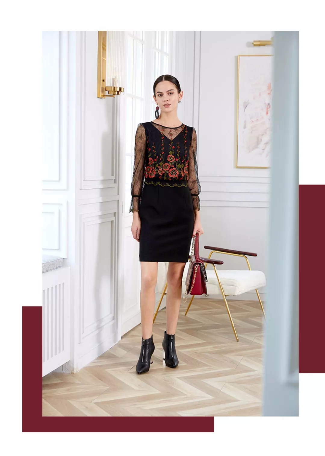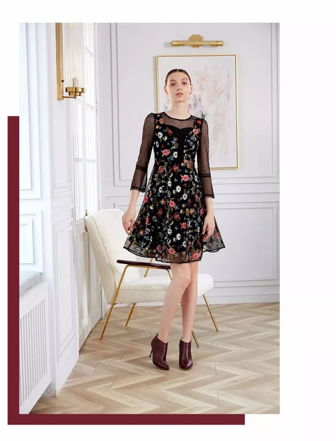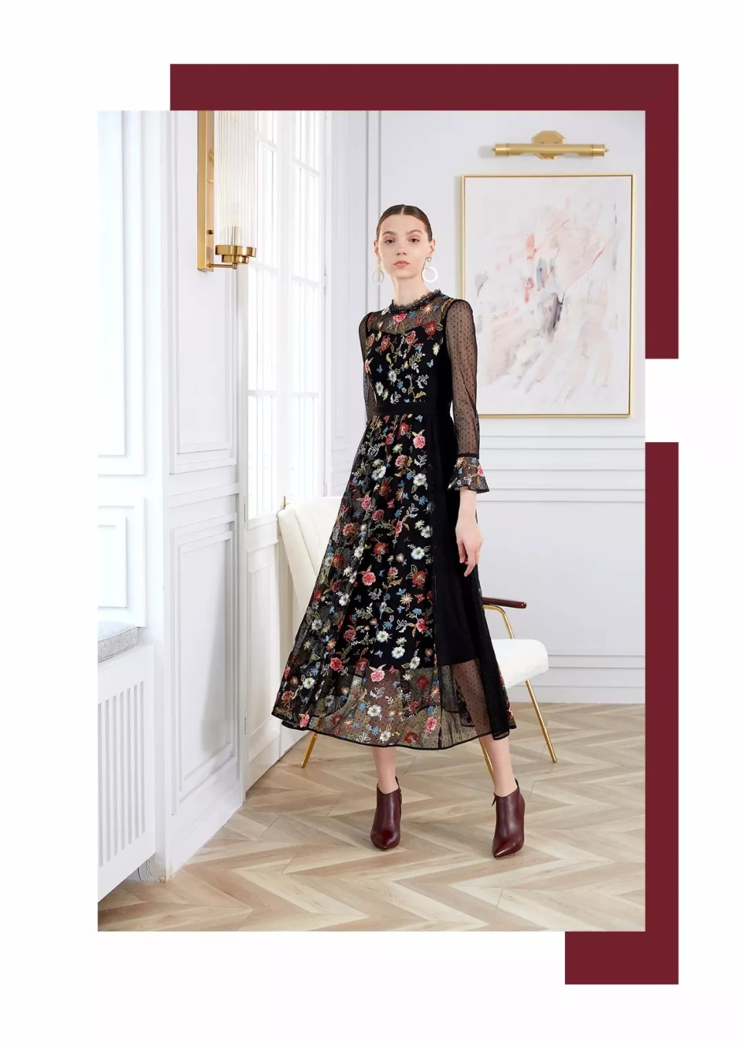 繁多的色彩以绣花的形式打造华美姿态,一枝枝、一束束,零散而不凌乱,花意盎然,着身高雅吸睛,别具匠心的肩部、手部透视及微喇叭袖半袖设计,唯美精致,错落有致的花纹凸显着高雅格调。