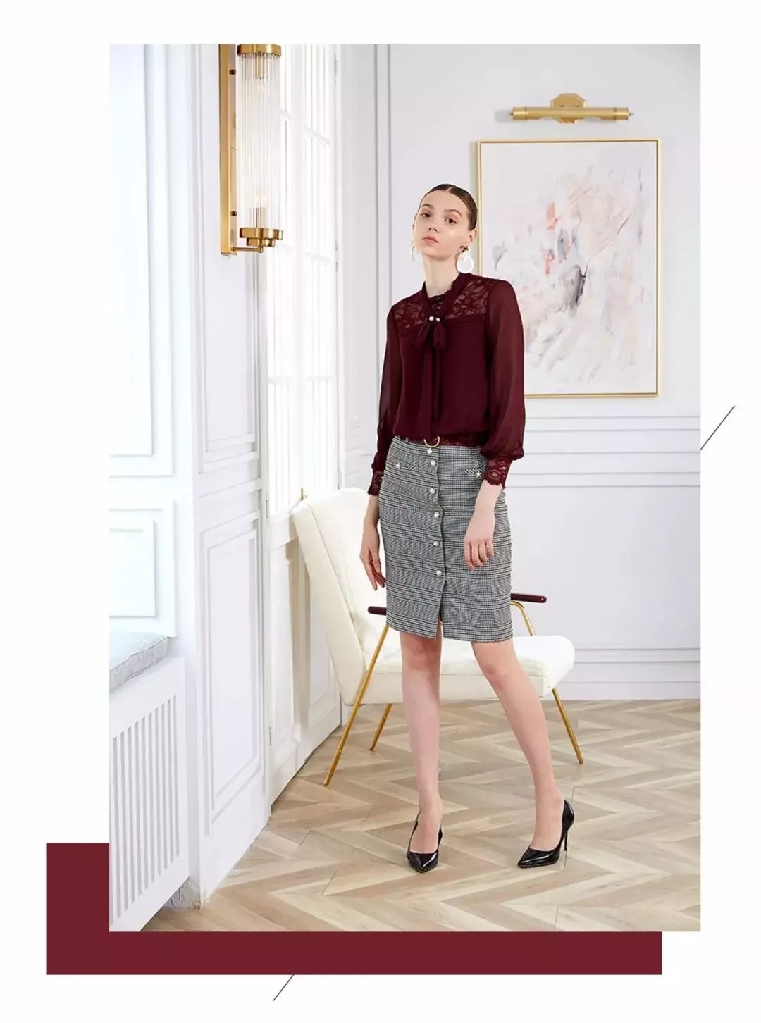 衬衫是每一季都不可缺少的,简约干练沿用了OL一惯的简约风格,领口飘带式的领型,加上珍珠扣作装饰,工艺设计理念非常强,如果你不想在重复以往的穿搭,不妨试试经典格纹裙搭配,提高腰线,看起来高挑纤瘦又优雅十足,呈现完美的实际曲线。