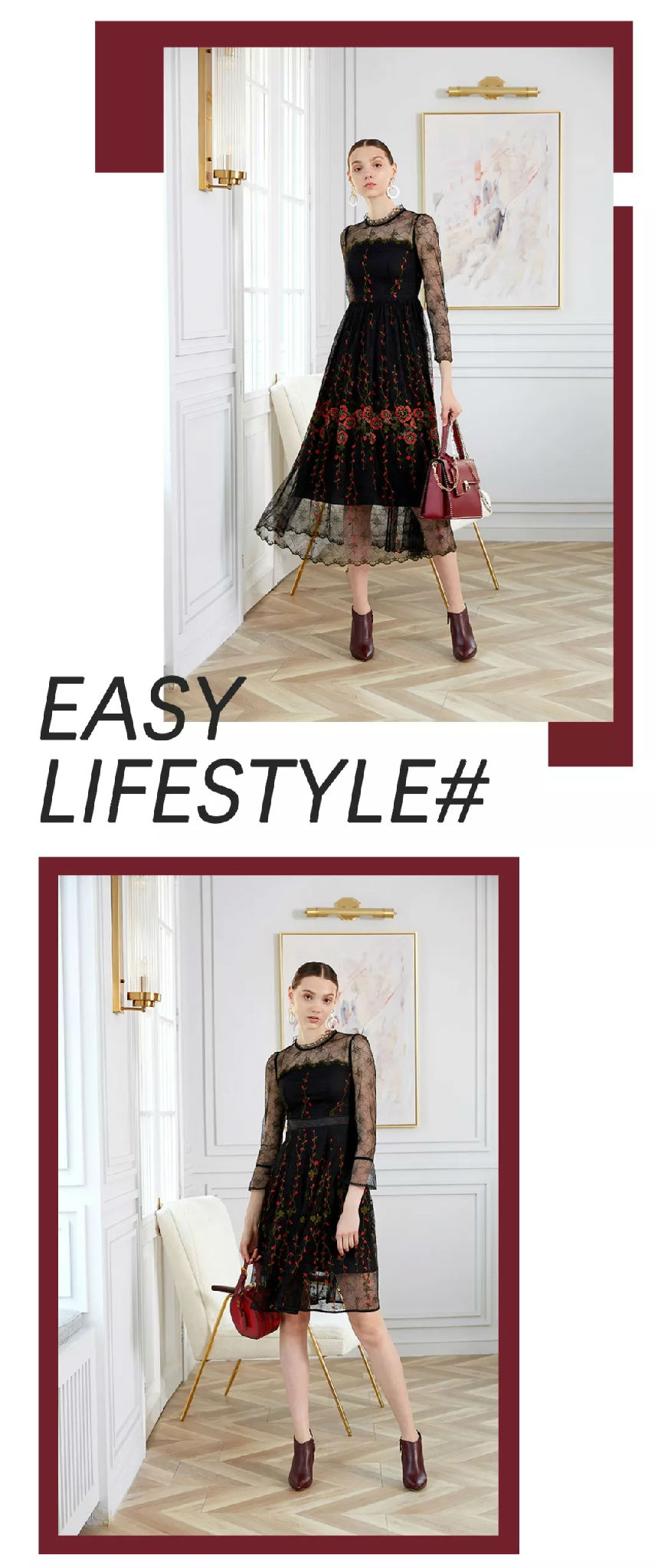 精致的网布绣花,玫瑰花朵色彩,锦簇的花团,如同心花自开,领口的花边点缀,宫廷风十足,X廓形设计,凸显腰身,优雅的大裙摆,每一步都宛如繁华在身边飞舞。