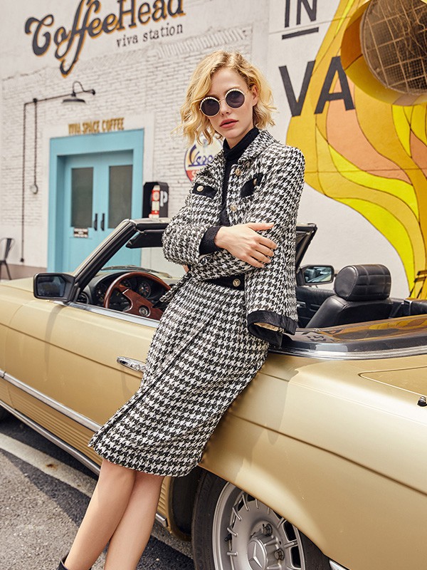 经典的单品有其存在的价值,运用经典的色系、经典的单品能够提升造型的时尚感,同时避免踩雷。TITI女装品牌的这款千鸟格套装,千鸟格元素时尚个性,配色经典,简约不失设计感的款式,让造型更具韵味。上身内搭一件黑色高领打底衫,颜色经典百搭,高领设计更具保暖性。下身的千鸟格高腰半身裙,知性大方,打造出了时髦有品位的造型!
