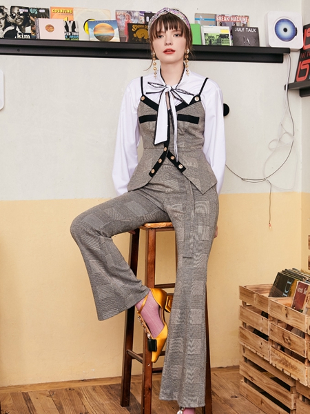灰色TITI上衣马甲,搭配起白色的蝴蝶结衬衫,休闲又时尚。再配上同款裤装和黄色高跟鞋,都市风范尽显。搭配浅色的耳饰,相得益彰。