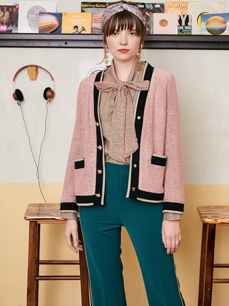 袖口、领口以及口袋边的黑色设计,为整体的造型增色不少。既显示粉色的独特,又突出黑色的神秘。内搭TITI衬衫,蝴蝶结的领带设计,表现淑女的优雅范。
