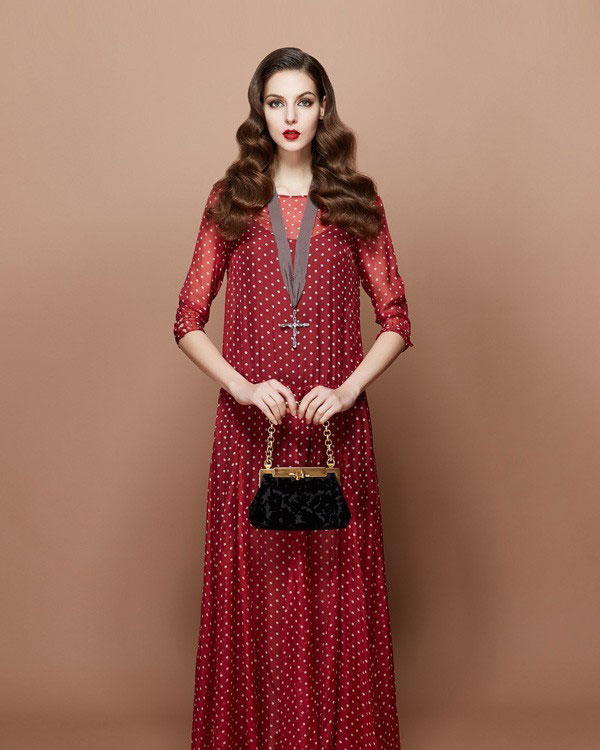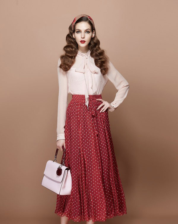 TITI 的裙子就蕴含这般古典浪漫的情怀。优雅高贵的酒红色点上如满天星辰般的小白点,端庄华美之中别有一番甜美的风情,深浅明暗的设计搭配避免了视觉上的单一,给人带来高级的层次感。红色若再配上黑色,呈现的就是宛若贵族般的华丽感,黑色的尖头鞋和精致的小包包起到的正是这样的作用,进一步加深了整套搭配的优雅和贵气。