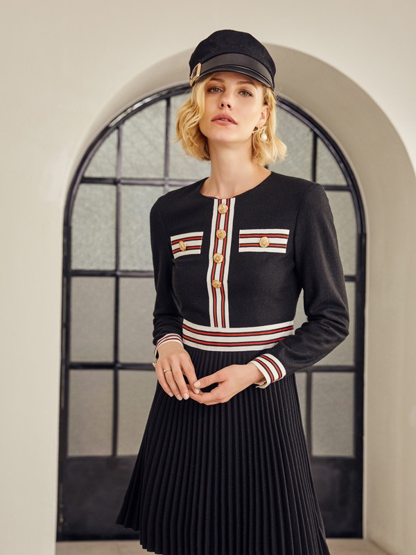 黑色连衣裙的穿搭也是很受欢迎的,圆领的设计将自己的脖颈曲线修饰的很好看,黑色搭配条纹的元素很是时髦,纽扣的装点让这款连衣裙看起来很是复古时髦,修身的版型穿在身上将自己的好身材完美的展现出来,黑色的颜色不仅显瘦还很百搭的,搭配一双高跟鞋,整体的造型简约大方,不需要多余的装饰穿出自己的复古优雅。
