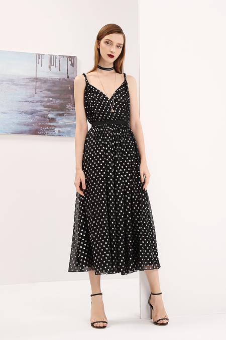 赫本穿火了小黑裙,从此女生的衣橱里又多了一件必备的黑色连衣裙。这款吊带长款小黑裙,是不是显得更加的大气优雅呢?裙身的波点设计女人味十足!就算是出席比较重要的场合也完全驾驭的了哦!