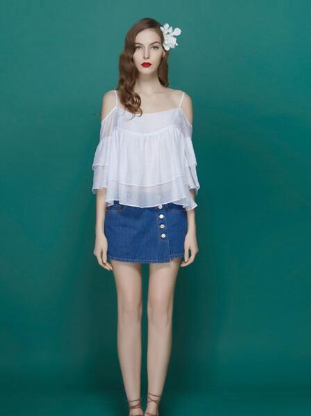 从去年开始霸屏街拍的一字领再到今年的斜肩元素,甚至可以通过衬衫等单品的穿着改良达到露肩效果。性感、娇俏和甜美都是露肩上衣自带的标签,尽情展现女人味。牛仔裙并不是视觉重点,却是***的辅助,毕竟裙装的柔美与露肩雪纺上衣画风颇为和谐。