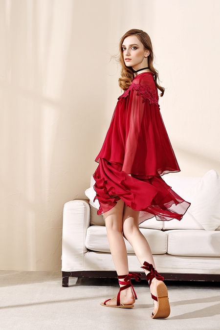 这款红色斗篷设计的连衣裙更显瘦而且还能时尚感加分,性感奢华的雪纺面料和肩部的花边完美融合,显得更加娇小可爱,显瘦的同时还非常显腿长,想要秒变大长腿就穿它吧!