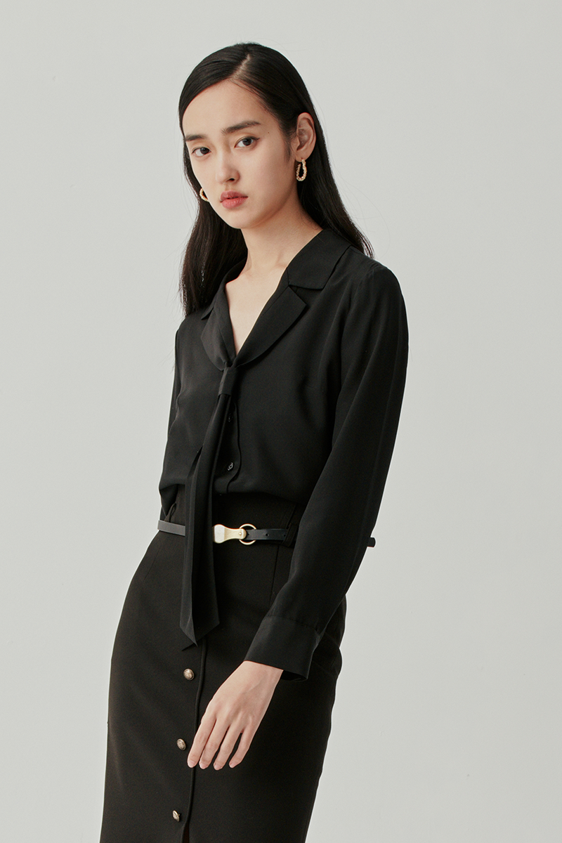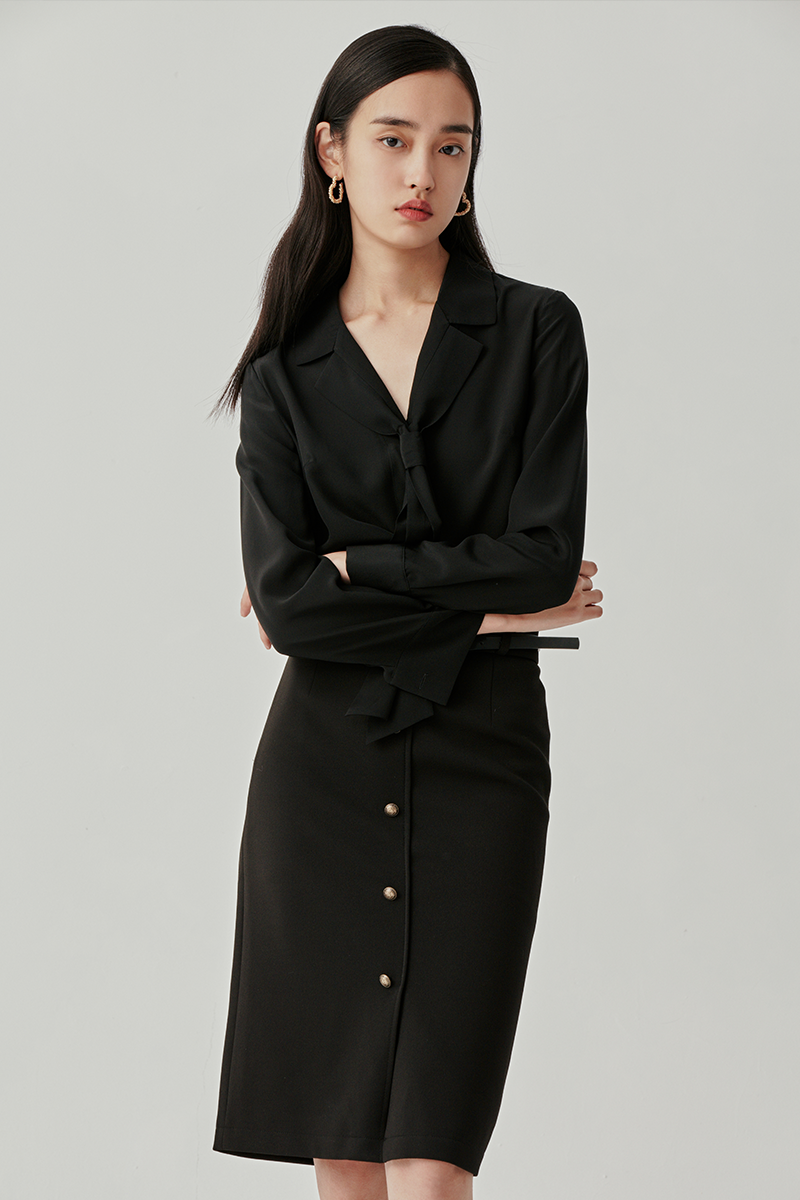 旖旎有锋芒的黑丝缎衬衣,正式感之余,利用领结化距离感为活力。中和全黑职装过分犀利的工作风格,弹力包臀裙举手投足间散发的柔美力量,与金属排扣形成惊喜组合,召唤细腻与知性并蓄的职业素养加分项。