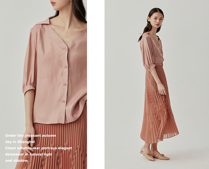 褪去一身铠甲,回归内心的温柔,让味蕾沉浸在馥郁的茶香里。独特的压褶半裙是摇曳在秋风中的矜持,诗意线条勾勒灵动的精致与典雅。闪烁细腻光泽的V领衬衫,将蔓延在衣着里的点滴美好融入生活。