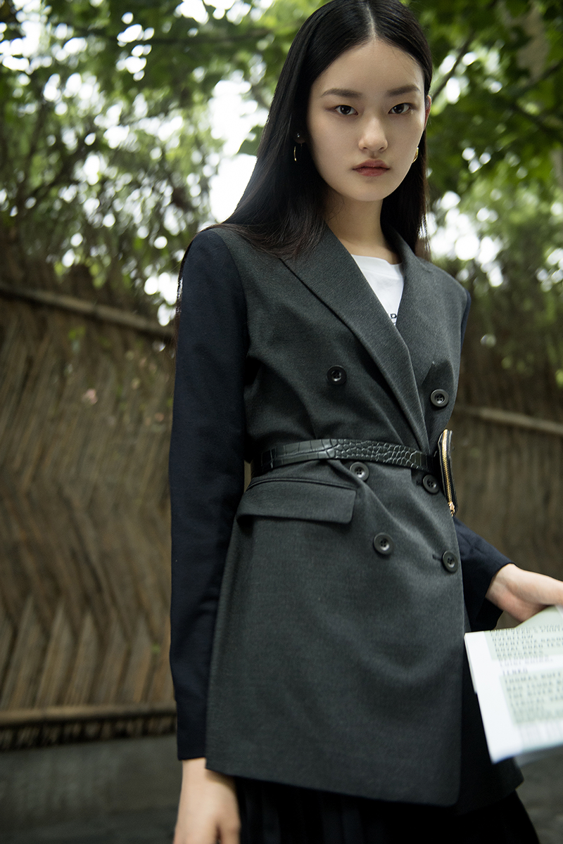 All Black聚焦勇敢无畏的自我构想,利落西装描绘出理想的职场形象。硬朗感十足的戗驳领&双排扣,暗示运筹帷幄的淡然笃定,平衡法则下,借由精纺羊毛褶裙,调和不由自主的盛气凌人,突显更时髦亲和的行事魅力。
