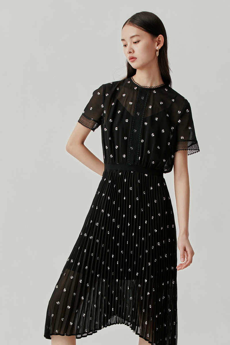用轻透雪纺制造半透明效果,让所有闷热瞬间化为乌有,薄纱材质因为熊猫刺绣的陪衬,渲染出都市女性对郊野生灵的喜爱之情;不规则百褶裙摆动静皆宜,踱步流转间,撩拨迷人的温柔魅力。
