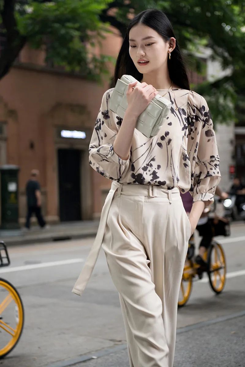 轻盈雪纺突破衬衫的落拓属性,保证柔软度与舒适感的同时,熊猫刺绣与领口飘带突显出的女性化精致,为通勤着装带来别致柔情。搭配同色系锥形裤平衡女人味,是职场中理性十足的仪式感。
